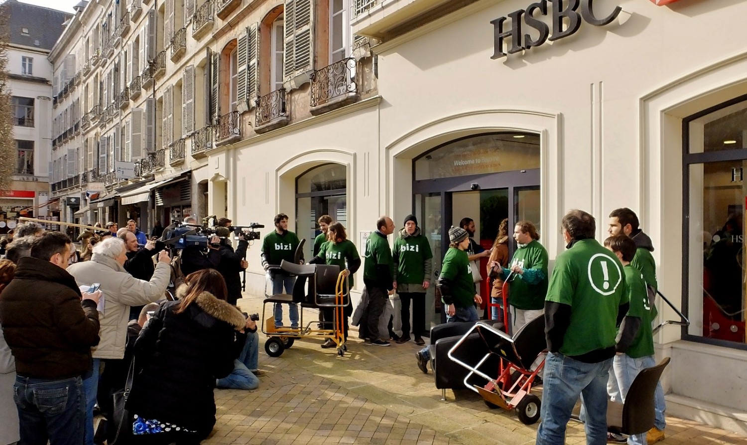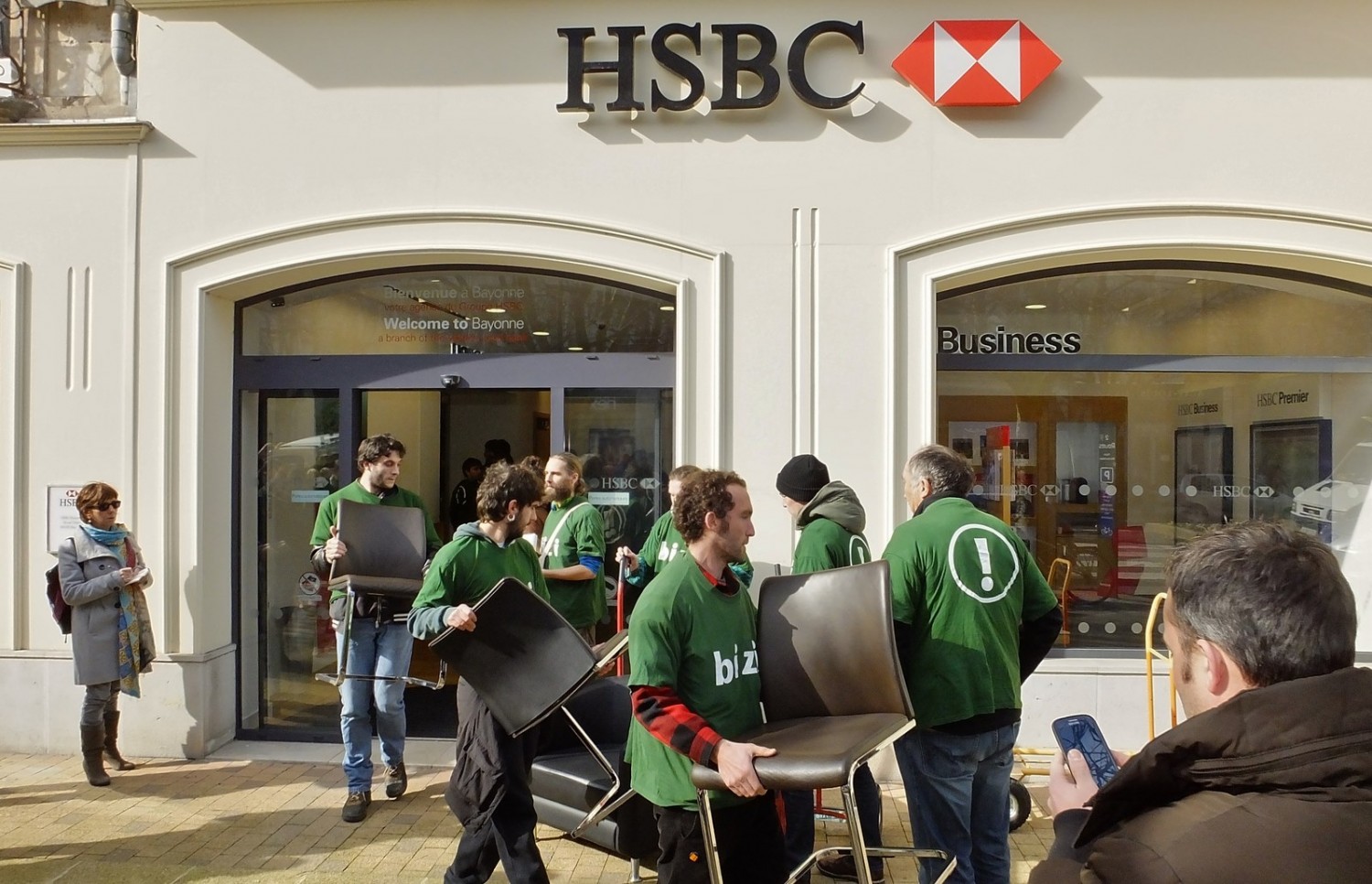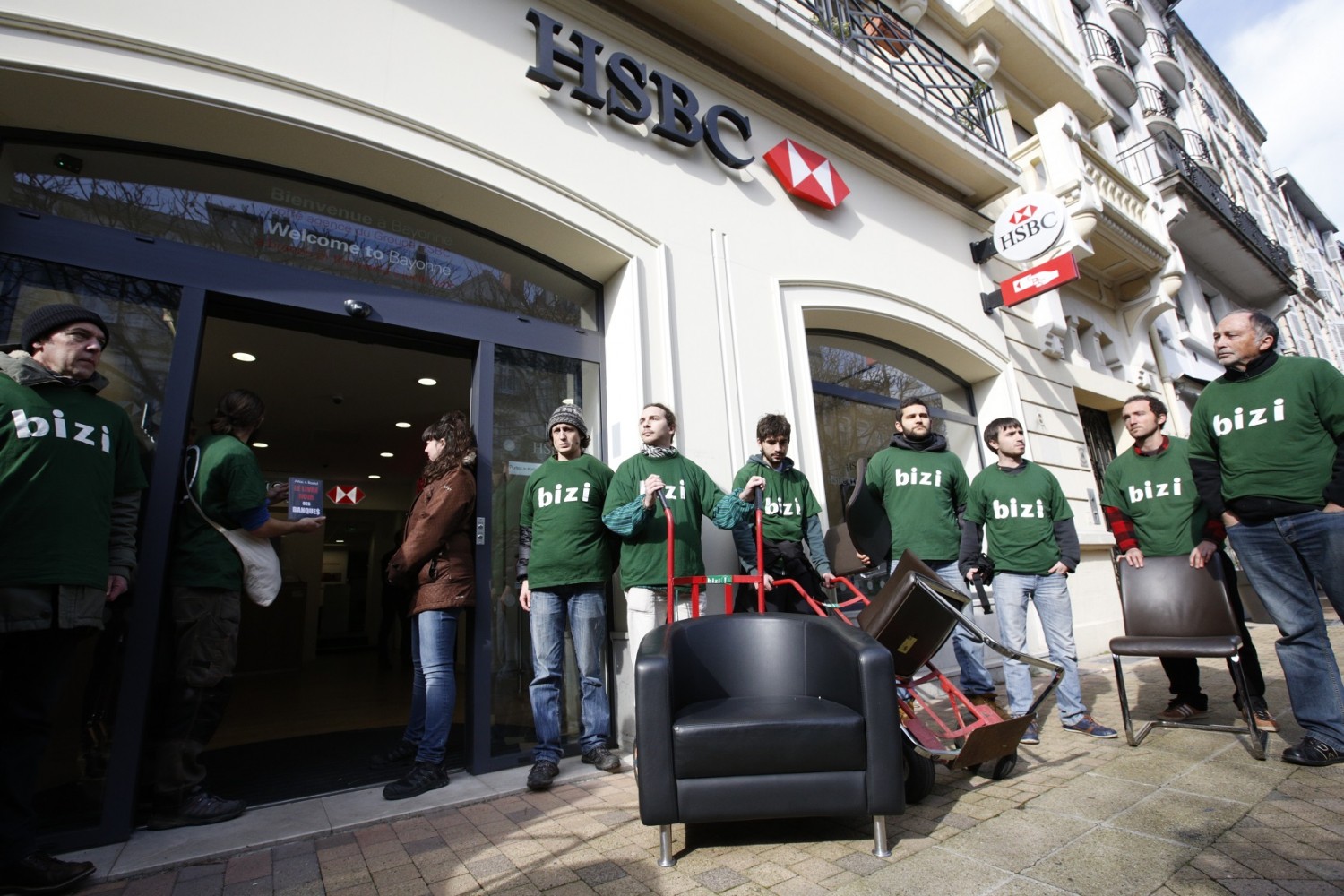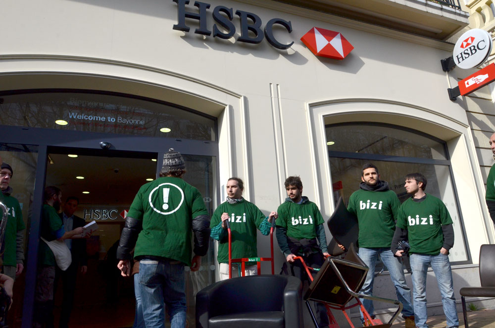 Jeudi 12 février à 14H30, 17 militants du groupe altermondialiste basque Bizi ! se sont emparés de sièges de l’agence bancaire HSBC située rue Thiers à Bayonne et les ont installés au local de leur mouvement.