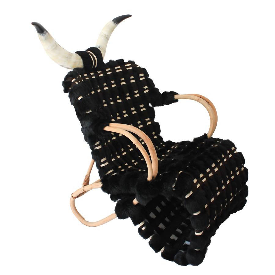 - Le Préhistorique…. Retour aux sources, à l’essentiel, à l’essence même de l’être… la Préhistoire. L’ossature en fibres végétales allie solidité et souplesse, robustesse et légèreté. La peau qui orne et entoure cette création aux lignes épurées couvrait et réchauffait les hommes autrefois. Elle est brute mais douce, en harmonie avec l’ossature mais tranche aussi sa teinte d’origine. L’origine…, l’animal…, la corne africaine bicolore élance et donne de l’envergure. Le trône d’un chef victorieux d’une tribu Préhistorique.