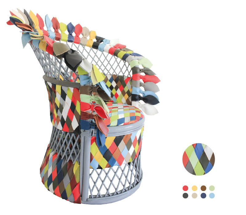 - Le Cercle Vertueux… Notre cercle de confort, c’est notre cocon, tout ce que nous savons bien faire, bien vivre, nos protections habituelles, nos éternelles ritournelles, nos anges et nos démons, nos habitudes, le monde intérieur et extérieur que nous connaissons. En dehors du cercle, c’est l’univers du risque, de l’inconnu, de l’improbable, de l’aventure, de l’excentrique. C’est en dehors du cercle que j’ai trouvé le « cercle vertueux ». Tout de cuir vêtu, cette création explosive est issue de plusieurs paris : Comment réunir autant de couleurs et rester harmonieux ? Comment ouvrir le cercle ? Ce fauteuil en rotin mi-apache