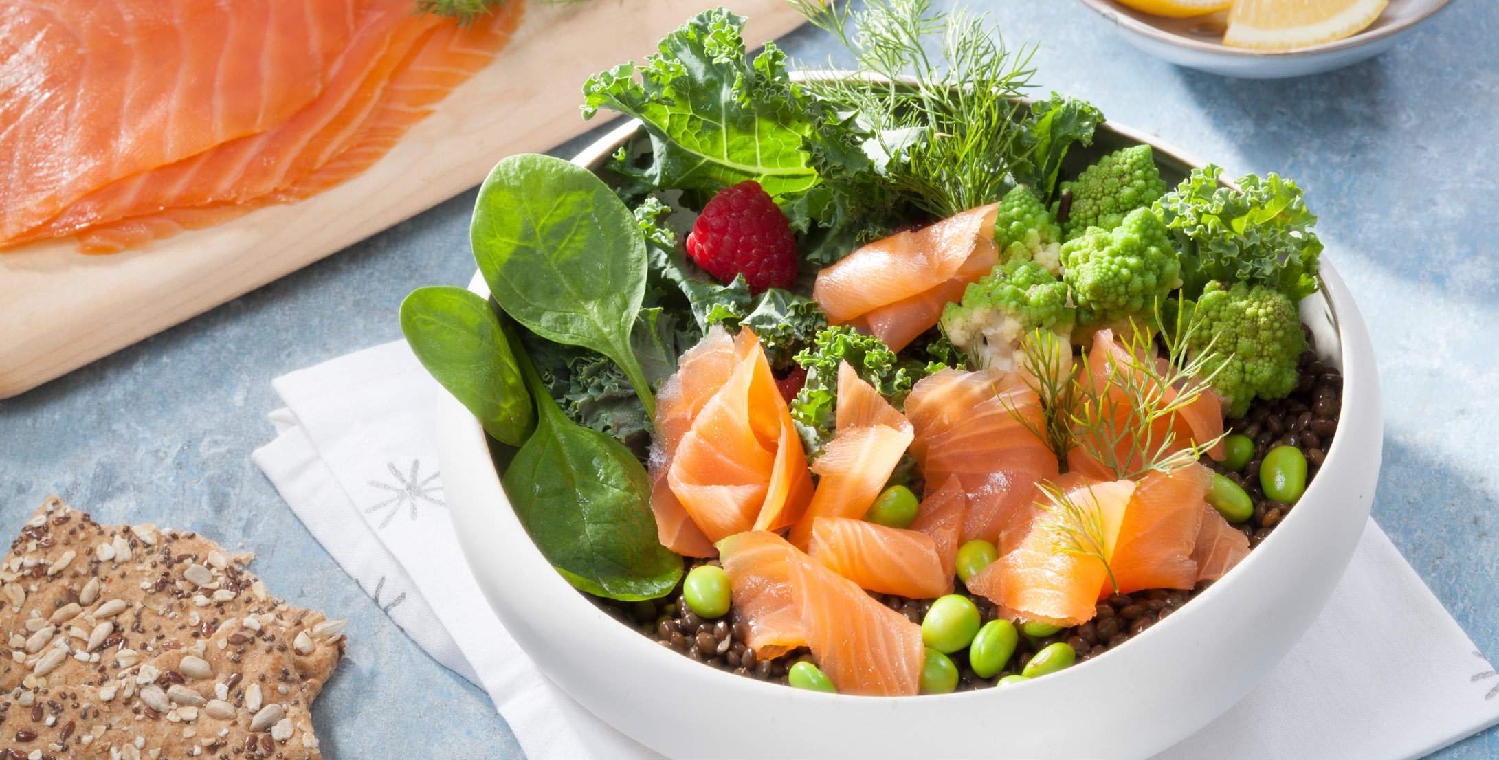 Les pousses d’épinards et le kale sont soigneusement rincés, puis préparés en retirant les parties trop fermes. La truite fumée est ensuite découpée en fines lamelles.