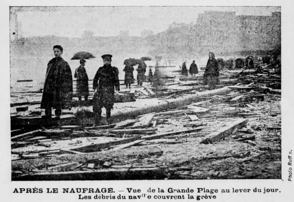 Vers 6 heures et demie du soir la nouvelle se répandit qu’un voilier venait se jeter à la côte, du côté de la Grande Plage et aussitôt après, les appels de détresse de la sirène du bord, les signaux du bateau, attirèrent une foule énorme en demandant du secours.